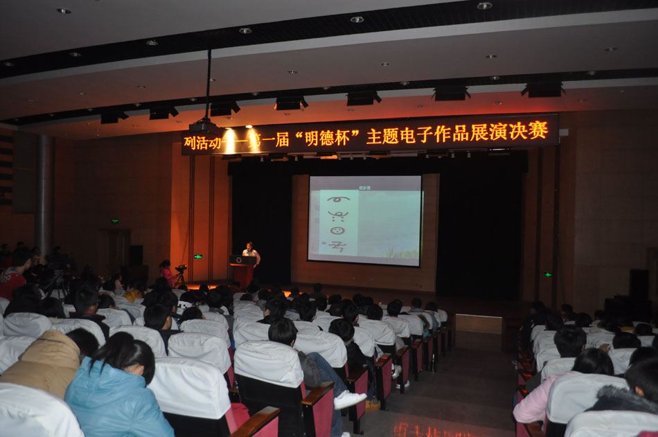 2011年12月8日下午4点至6点,由思政课教研部举办的“思想道德修养与法律基础”课实践教学系列活动之——第一届“明德杯”主题电子作品赛决赛在图书馆报告厅举行。思政课教研部全体教师和公司2011级本、专科400多名员工代表观看了比赛。