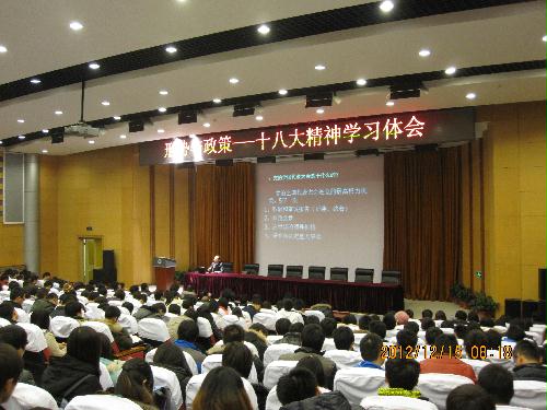 为帮助广老员工深入学习十八大精神,12月15日,思想政治理论课教研部在图书馆报告厅举办了学习十八大精神报告会,思政部贾作璋老师作专题报告,部分思政课专兼职教师及400余名员工聆听了报告。 报告主要从三个方面展开:一是党的全国代表大会是什么、干什么?二是十八大报告的关键内容有哪些?三是青年应当以怎样的自觉、责任、担当和精神状态学习贯彻十八大精神,努力实现十八大确定的宏伟目标?