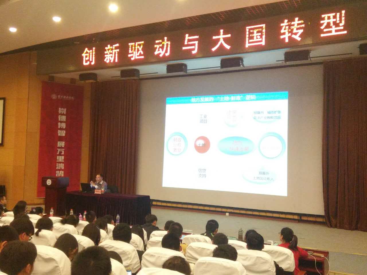 2017年4月20日下午,思政部邀请国家行政公司经济学部公共经济教研室主任、经济学博士、硕士生导师、樊继达教授为全院员工在图书馆报告厅做题为“创新驱动与大国转型”的专题报告。思政部教师及400多名员工代表聆听报告。报告以中国经济增长的三维框架:中央政府、地方政府、中国企业为线索,从我国当前发展阶段性特征、中外历史经验教训、美日欧等为首的世界主要发达国家的发展经验等角度,深刻分析了中国发展必须从要素驱动、投资驱动向创新驱动的原因、必要性以及中央政府、地方政府及企业各个层面推进创新驱动应有的主要举措,以实现中央政府从“追赶型”向“战略型”、地方政府从“竞争型”向“服务型”、中国企业从“套利型”向“创新型”的基本转型,最终实现我国整体性“大国转型”。讲座主线明确、思路清晰、内容丰富、信息充实、视野开阔,直面现实,指引方向,既专业、系统又朴实、直观,质量很高。图书馆报告厅座无虚席,同学们的听课率极高,效果良好!