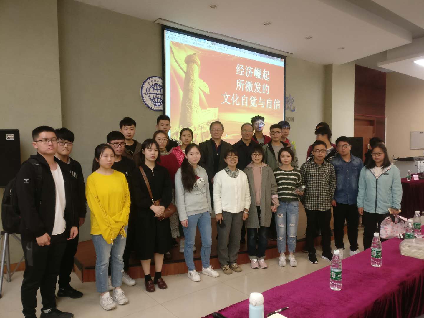 2018年4月12日,受思政部邀请,摩罗(原名:万松生)教授在图书馆多功能厅做了题为“中国经济崛起所激发的文化自信”的报告。思政部教师及员工共100多人聆听。报告主要从一百年来中国流行的自我认知模式、中国经济崛起激发的自我认知变化和战略雄心、如何理解今日我国的世界地位、中国崛起的奥秘在哪里、中国的文化优势在哪里等五个方面做了讲解。报告结束后,贾作璋主任做了总结。此次报告贯穿十九大精神增强了同学们的文化自信,同时也弘扬中华民族传统文化。