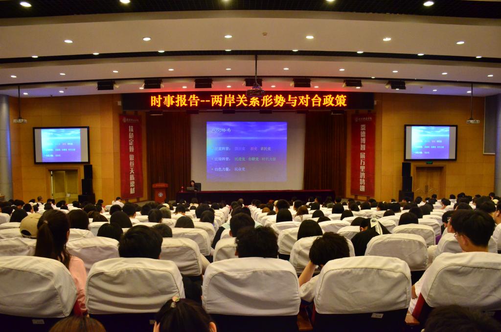 谢郁主任从台湾地区政党格局与政局走向、复杂多变的台湾民意、当前两岸关系与台海局势、中美关系与台湾问题和中国政府对台方针政策等五个方面进行讲述,深刻分析当前两岸关系复杂多变形势的历史背景,对台工作面临的机遇和挑战,全面梳理了党和国家对台政策的演变,使广大师生充分认识到国家强大、民族复兴、两岸统一是历史大势,是任何人任何势力都无法阻挡的,祖国和平统一系于民族复兴、成于遏制逆流、立于融合发展。希望未来两岸一家亲,共圆中华民族伟大复兴的中国梦。谢郁主任深厚的学术底蕴,幽默的语言赢得与会师生们的一致赞许。会后,谢郁主任还与部分师生就当前台海形势的热点问题进行了深入交流。(撰稿、摄影:田艳天)