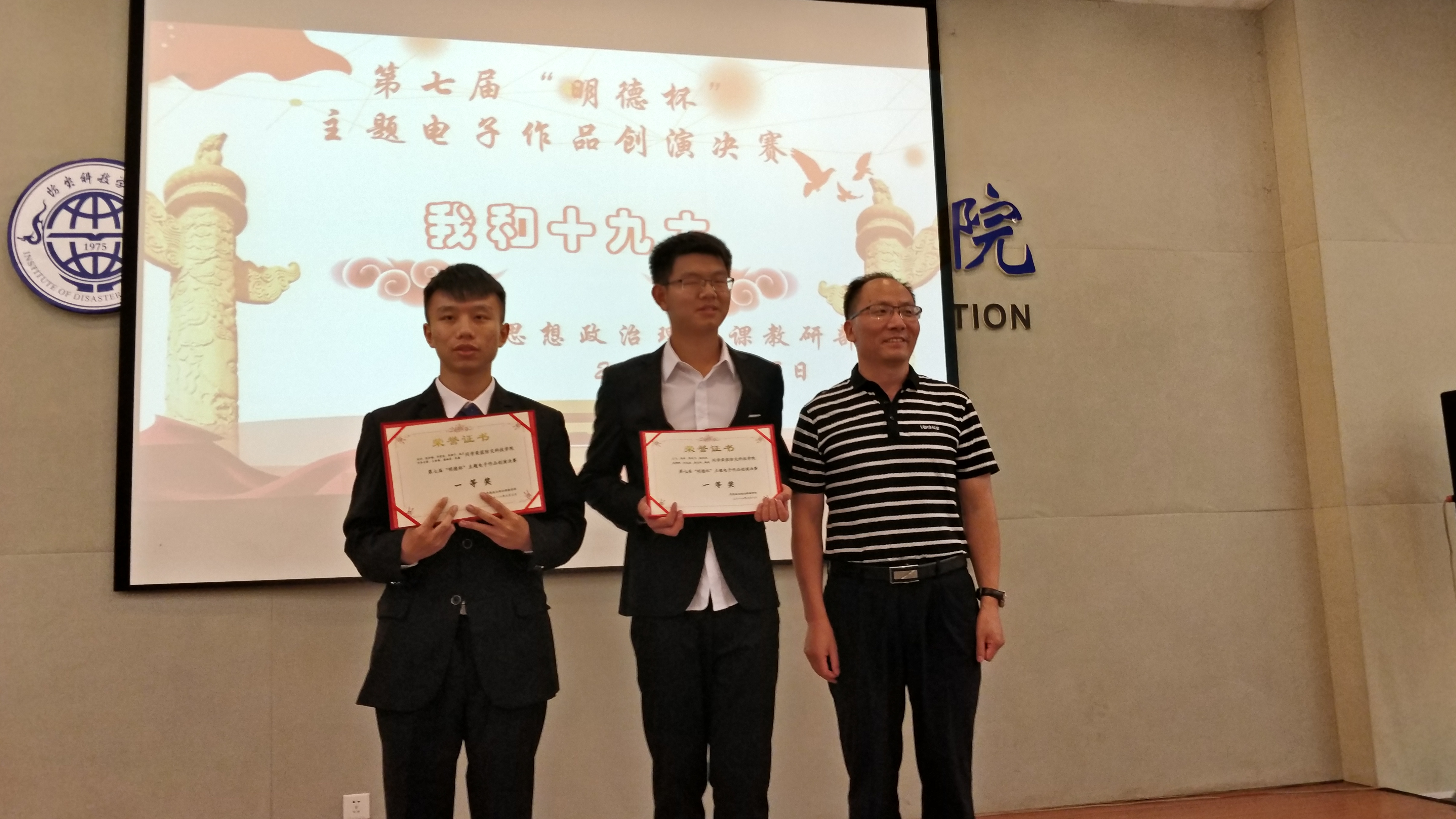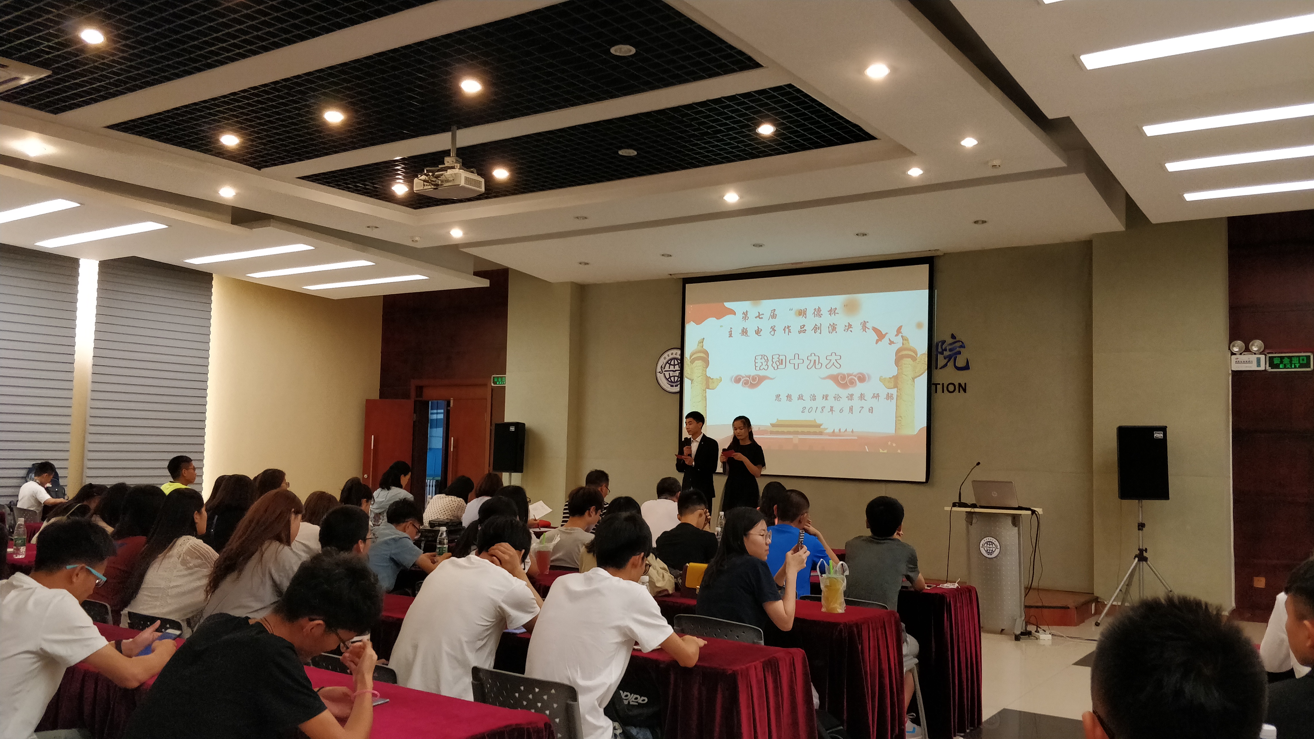 2018年6月7日晚7点9点,“思想道德修养与法律基础”课系列实践教学活动之——第七届“明德杯”主题电子作品创演决赛实践教学活动在图书馆功能厅如期举行并圆满结束。思政部部分老师出席决赛并担任评委。