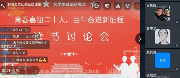 在读书讨论会上,来自五湖四海的同学们谈古论今、积极畅言,围绕阅读《中共中央关于党的百年奋斗重大成就和历史经验的决议》、《习近平关于青少年和共青团工作论述摘编》、《习近平谈治国理政》、《习近平与老员工朋友们》、《习近平的七年知青岁月》等书籍文献的过程并结合自身经历,和大家分享了自己的心得体会。例如,杨喆涵同学结合参与贵州省铜仁市团市委老员工春晖服务社志愿服务活动的经历,表达了对党领导下家乡发展变化的深刻感受;孙俊涛同学讲述自己来校求学以来的心路历程,表达了学成之后回到广西、扎根服务家乡的心愿;陈力成同学为大家介绍了家乡福建平潭从落后海岛到热土新区的转变,满怀对党的真挚情感。