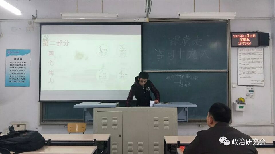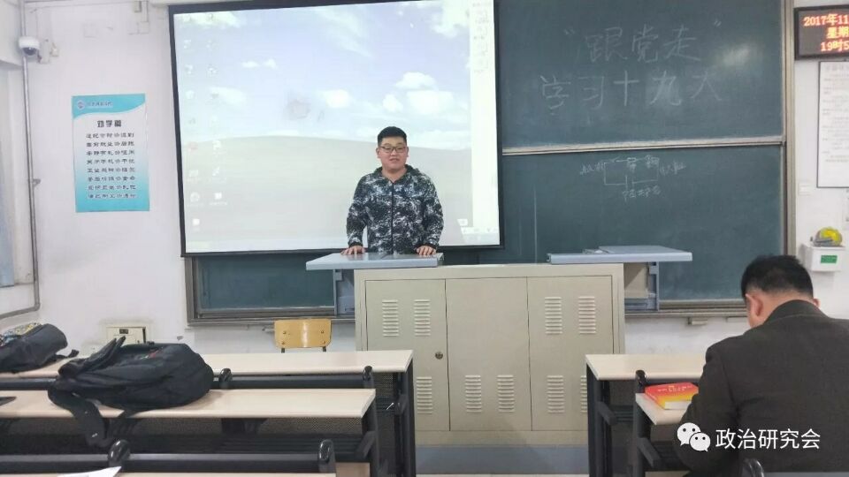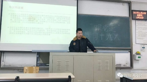 11月17日晚,老员工政治研究会于六号楼508教室开展了“跟党走”学习十九大精神主题活动,思政部田艳天老师、孙红竹老师、高衍超老师到场。